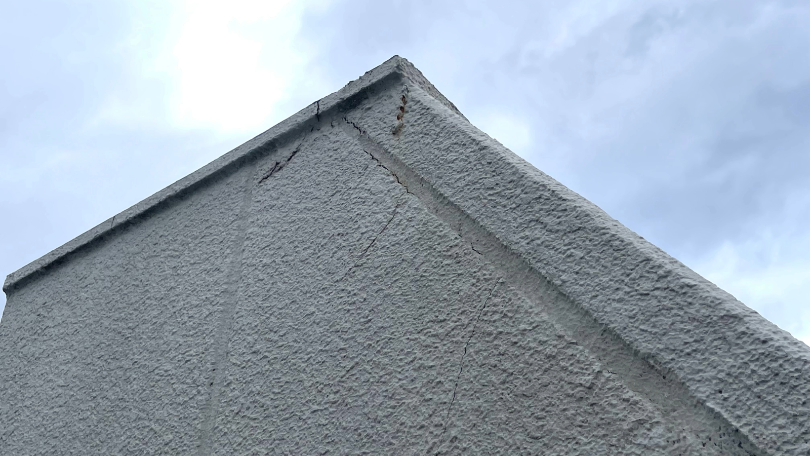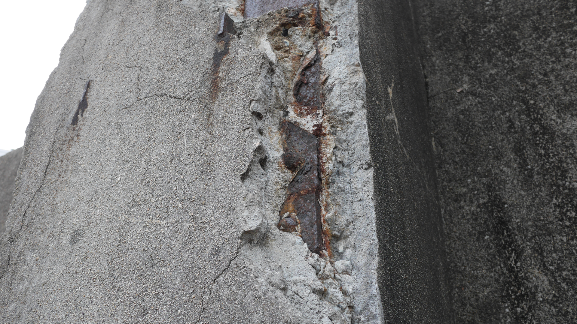 コンクリートの壁の一部がボロッと崩れ落ちていたり、茶色い汁が垂れていたりしないかな? それは壁の中にある鉄筋が錆びて膨らんで、内側からコンクリートを押し割ってしまう「爆裂」という現象なんだ。 家の骨組みが悲鳴を上げている深刻なサインだから... -